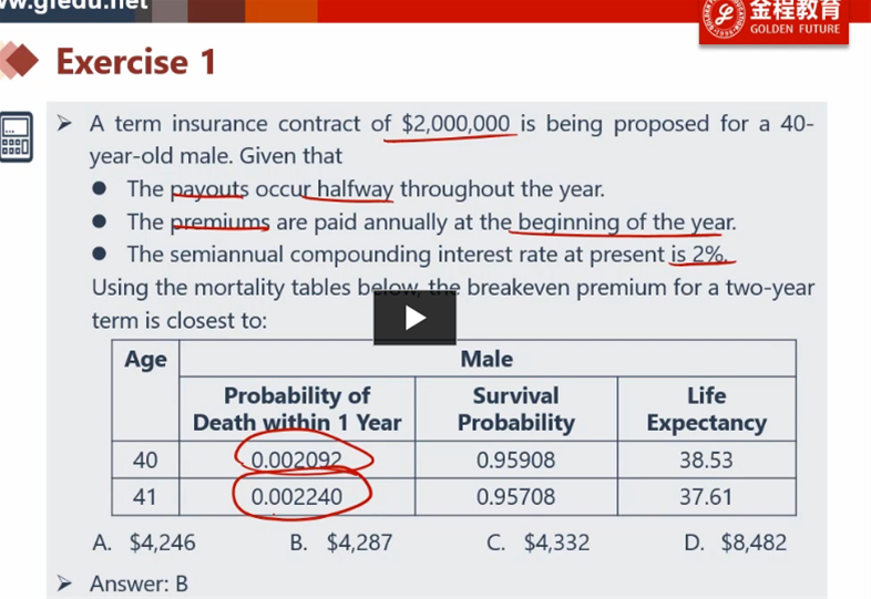 请问 关于保险的breakeven premium的题 ,是否只在计算时考虑带去probability of death的概率,完全不需要考虑survival probability(即使题干给了),就是用1-死亡率计算存活率是吗?survival probability是迷惑项?(答疑区老师说是边际概率 不太懂)