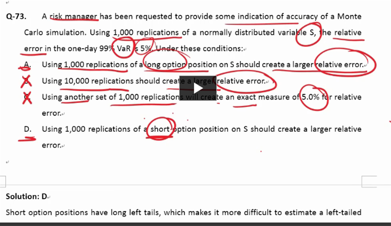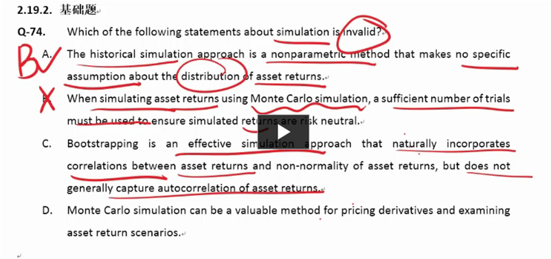 请问 如图这道题 选项都给的是 使用1000 replications,10000 replication这样 。如果是replications的话 就是复制的值,那么就是没有创造新数据和新残差的蒙特卡罗模拟。这么思考的话那么B,C的理解就很不一样了。请问这个词 应该如何理解?(如果是“复制”的话,那么c还真是对的。)
