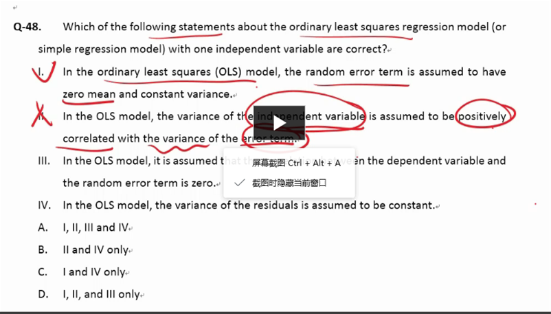 请问百题58题d是这样说的 If a process is stationary, has zero mean, has constant variance and serially uncorrelated, then the process is white noise.请问如果没有说process is stationary只说后面三项,是不是也是对的?(就是没提及平稳与否 就默认是判断过了协方差平稳,直接判断是不是白噪声了?还是说 要都判断一下 没写 stationary就是没说完整是错的呢)