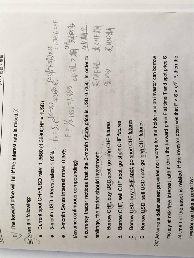这道题,答案rD-rF,把CHF看成国内,得出F=1.3656CHF;3月期货价1/0.735=1.3605CHF。这两个价格反映的是CHF的期货价吧?答案是usd的期货价。另外低估高估后如何套利,有没有简单记忆法