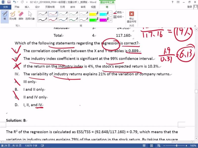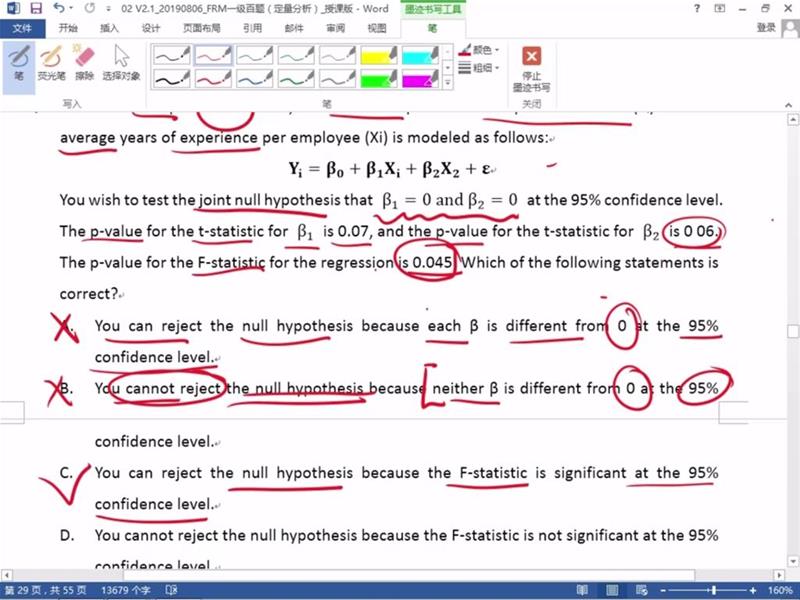 Q44AB老师的解析是不是有问题?看了答案,理由是联合假设检验要以F检验为准,老师解析的时候感觉这句话就万能了吧?她解析A的时候说后半句两个pvalue都大于0.05才对是什么意思?解析B的时候说前半句结论错,后半句对,那么后半句怎么理解?然后C选项对,为什么对呢,是0.045直接和显著性水平0.05做比较然后越小越拒绝吗?Pvalue中给显著性水平的百分比直接就是概率的意思吗