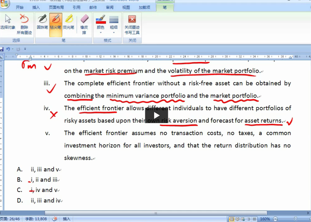 基础百题Q44,老师的讲解我是能理解的,可是在读题的时候并没有感觉题意是在说个人的风险厌恶系数会影响efficient frontier,只是说allow 不同的投资人根据自己的风险厌恶和对资产的预期收益去选择不同的资产组合。 感觉考到这样的题会纠结死!