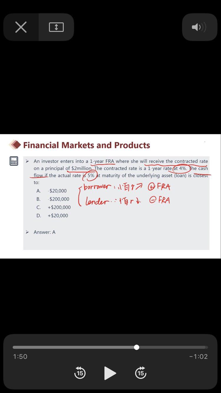 视频中老师讲的是, long 方 borrower ,如果利率上升,是赚的,short 方 lender ,如果利率上升,是亏的 而这道题的老师讲解题目说的是: long 方 borrower ,害怕利率上升,short 方 lender,害怕利率下跌 这两个老师讲的是矛盾的吧,因为long方不可能害怕赚钱吧… 我比较同意后面这个老师的说法