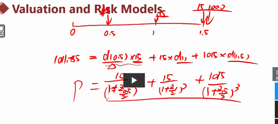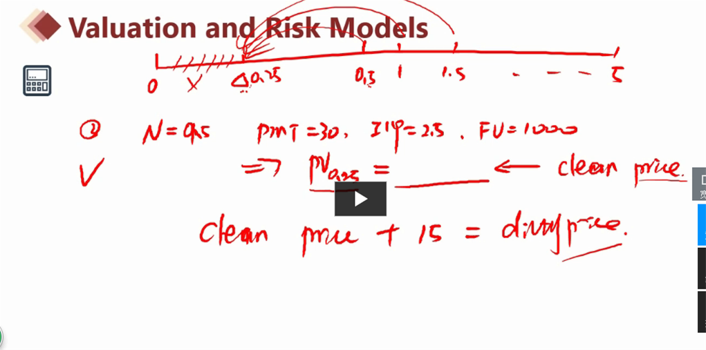 请问老师 为什么图一就是dirty price, 图二的另一种方法就是clean price.我认为把未来现金流都折现到t=0.25时刻也是把0.5时刻的那笔coupon算进去了 前90天的利息部分(即AI部分)还是包含进去的。所以应该是都折现到0.25时刻再减去15的应计利息AI才对。 您看 是不是视频讲错了? 或者我的思路哪里错了,求赐教