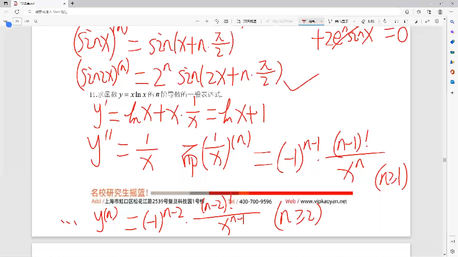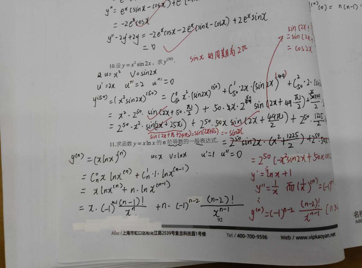 老师,我想问一下11题能不能用莱布尼茨公式,应为我这里将u=x,v=Inx,那x的二阶导=0,所以我觉得能用公式做,但是我用公式解出的答案最后与老师的不一样,还请老师帮我看看我是哪里错了,帮我解答一下。
